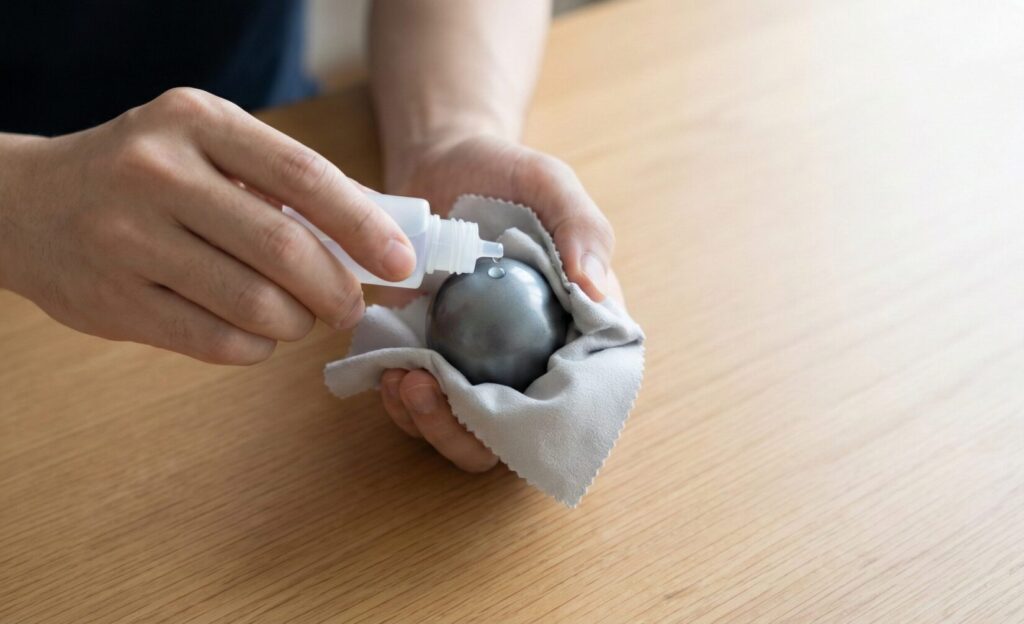 ここが重要なポイントです。柔らかい布(メガネ拭きのようなマイクロファイバークロスが最適)に、ボナンザ液を「ごく少量(1〜2滴)」垂らします。そして、ボール全体に薄く、均一に塗り広げていきます。表面がうっすらと濡れたような状態になれば十分です。液が垂れるほど塗るのは明らかに厚塗りしすぎですので、注意してください。