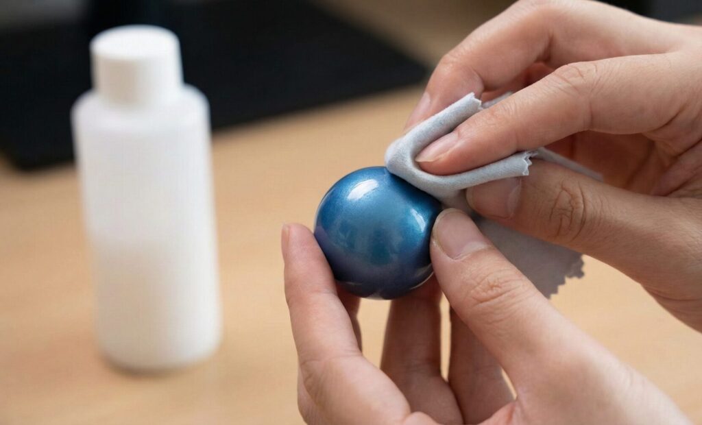 使い方は非常に簡単です。まずボールを取り出して中性洗剤で洗い、手垢を完全に落として乾燥させます。次に、クレポリメイトをティッシュや布に少量吹き付け(直接ボールにスプレーしないこと)、ボール全体に薄く塗り広げます。重要なのはここからです。すぐに拭き取らず、数分間放置して定着させてください。その後、乾いた布でピカピカになるまで磨き上げれば完了です。\