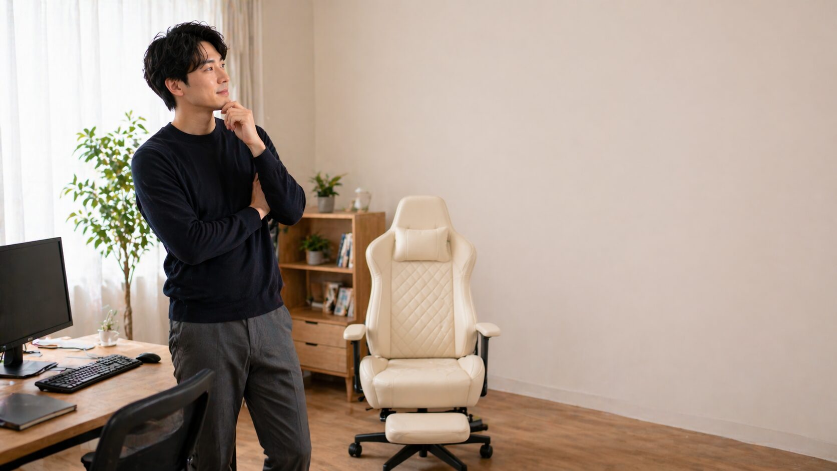 また、違いを比較するときは、使用シーンもセットで考えたいです。仕事専用の書斎で使うのか、リビングワークで家族の目にも入る場所に置くのかで、向いている雰囲気は変わります。書斎なら多少重厚感があってもかっこよくまとまりやすいですが、生活空間に置くなら柔らかい印象のほうがなじみやすいこともあります。私はこのあたりを「スペック比較」よりずっと大事だと思っていて、毎日見る椅子だからこそ、部屋の中で無理がないかを優先したいです。