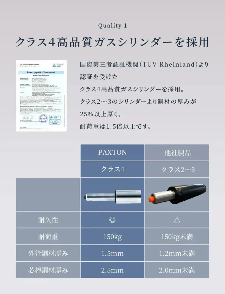 パクストンをおすすめしやすい理由のひとつは、値段が「見た目」だけじゃなく、耐久性や安全性に関わるパーツにも寄っているところです。代表例が、クラス4ガスシリンダーや耐荷重150kgといったスペックです。こういう部分は普段見えにくいですが、毎日座るならじわじわ効いてきます。