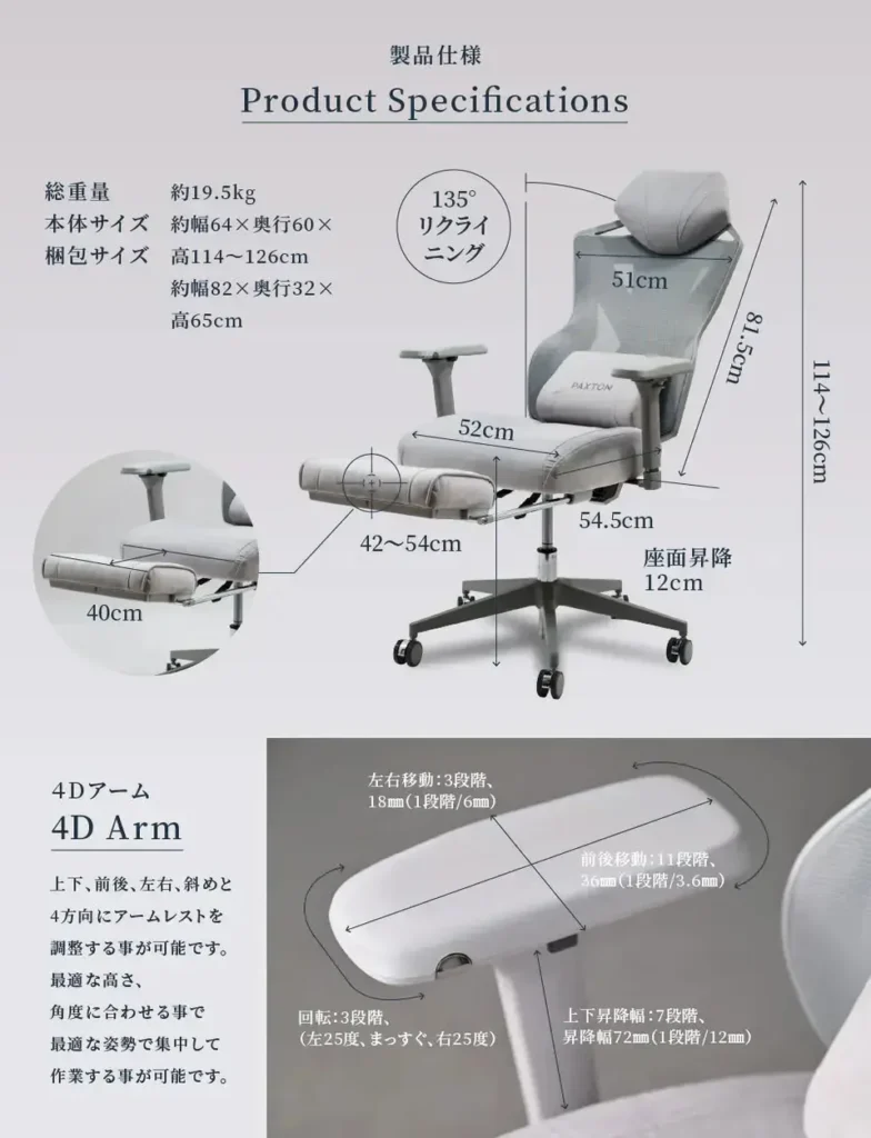 テレワークでは、「ガッと集中したい時間」と「少し肩の力を抜きたい時間」が交互にやってきます。パクストンの椅子は、座面の高さやリクライニング調整を組み合わせることで、集中モードとリラックスモードの切り替えがしやすい設計になっています。