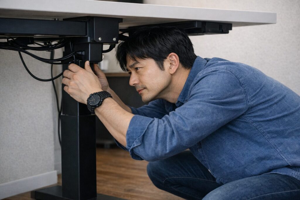 耐荷重オーバーの怖さは、故障だけではありません。揺れや傾きが大きくなると、モニターアームの動きも不安定になりやすく、画面の揺れや転倒リスクにもつながります。重い天板と重い機材が高い位置にある状態は、低い位置よりもバランスが崩れやすいです。とくに立ち作業で机を高くしているときは、わずかなぐらつきでも体感上かなり不安になります。私は、ここは「動けばOK」では済ませないほうがいいと思っています。