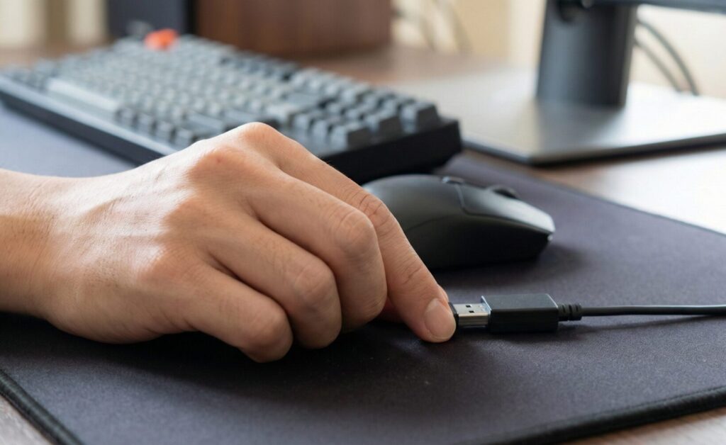 PC本体(デスクトップの背面など)のUSBポートにレシーバーを直接挿すのは避けましょう。PCの金属ケース自体が電波を遮る壁になったり、マザーボードのUSB 3.0ポートから発生する高周波ノイズが2.4GHz帯の無線に干渉したりすることがあります。