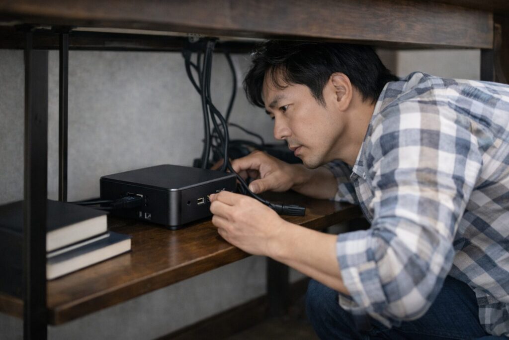 配線も熱対策の一部です。太いケーブルが絡んで本体の通気口を塞いだり、張力で本体が斜めになったりすると、排熱にも安定性にも悪影響が出ます。机まわりを見直すなら、ゲーム向け昇降デスクのおすすめと失敗しない選び方徹底解説のように、天板裏を起点にケーブルを流す考え方も参考になります。ミニPCは本体が軽いぶん、ケーブルマネジメントの完成度が使いやすさに直結しやすいです。